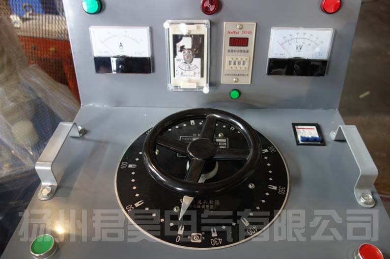 3、接電源前,電源控制箱(臺(tái))的調(diào)壓器必須調(diào)到零位。接通電源后,綠色指示燈亮,按一下啟動(dòng)按鈕,紅色指示燈亮,表示試驗(yàn)變壓器已接通控制電源,開始升壓。