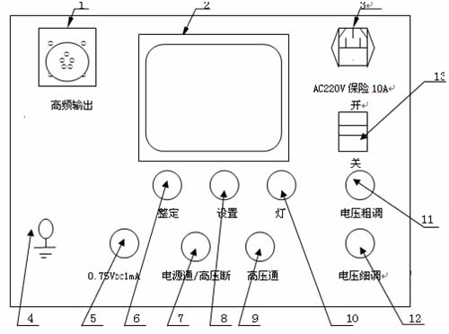 ⑼ 紅色帶燈按鈕、高壓接通按鈕、高壓指示燈:在綠燈亮的狀態(tài)下,按下紅色按鈕后,紅燈亮綠燈滅,表示高壓回路接通。此時(shí)可升壓。此按鈕須在電壓調(diào)節(jié)電位器回零狀態(tài)下才有效。如按下紅色按鈕紅燈亮,綠燈仍亮,但松開按鈕紅燈滅綠燈亮,表示機(jī)內(nèi)保護(hù)電路已工作,此時(shí)必須關(guān)機(jī)檢查過壓整定撥盤開關(guān)是否小于滿量程的5%及有無其它故障,檢查無誤后再開機(jī)。