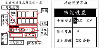 ⑵液晶顯示屏:顯示測(cè)量數(shù)據(jù);電壓整定數(shù)值;定時(shí)提醒;倍壓節(jié)數(shù)等,顯示內(nèi)容與您的操作有關(guān)。